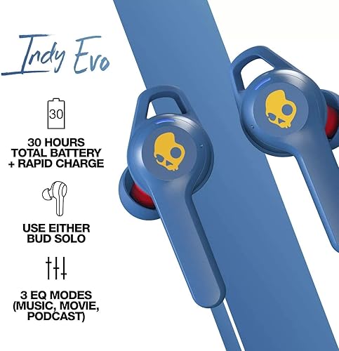 Skullcandy Indy Evo True Wireless Earbuds S2IVW-N745 – 30Hrs Battery, Rapid USB‑C Charge, IP55 Sweat/Water Resistance, Tile Tracking, Touch Controls, Dual EQ Modes, Blue