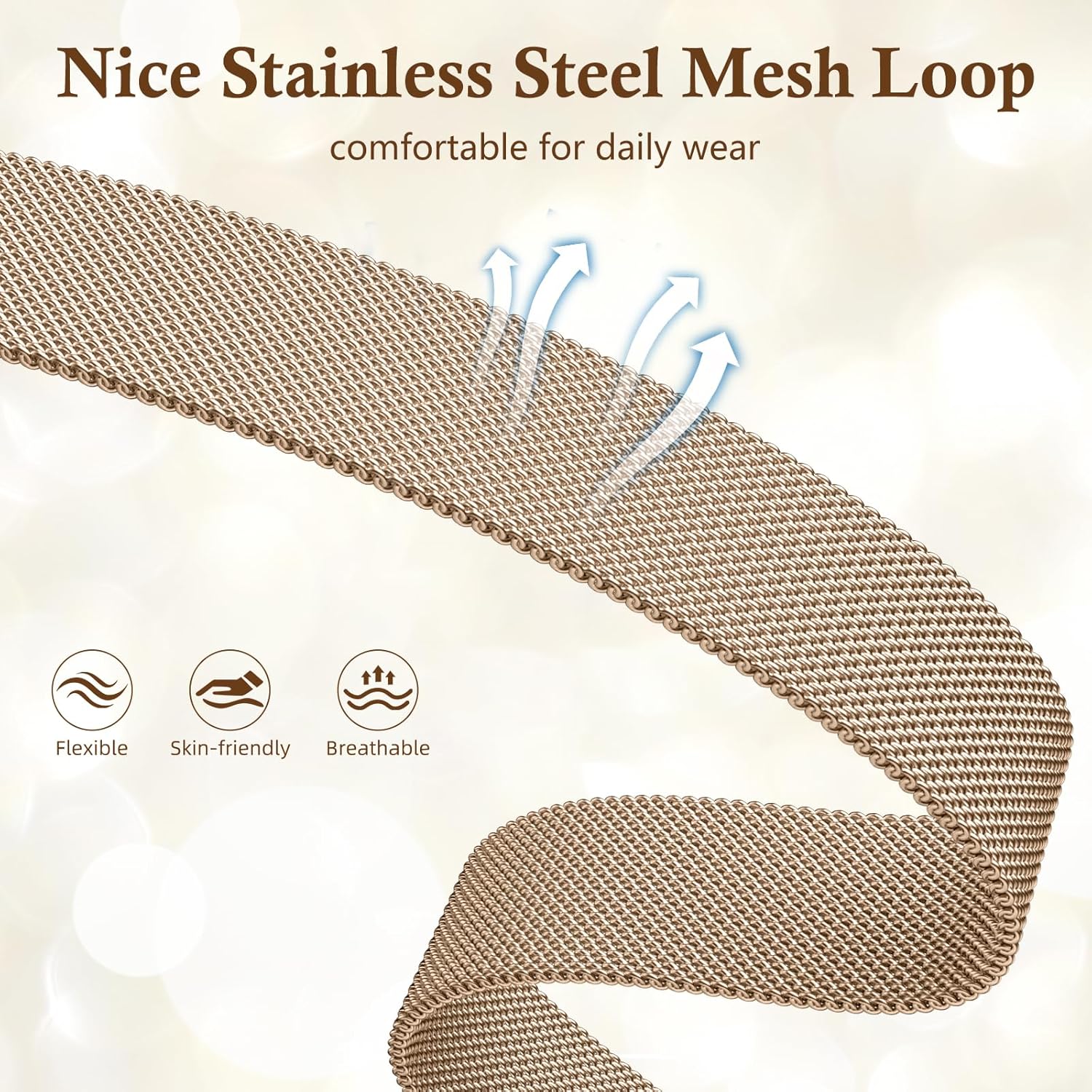 Premium Material: This rosegold apple watch bands for women is crafted from premium stainless steel metal with a polished finish, resulting in a smooth woven surface. Additionally, the precision-cut edges ensure it won't snag on clothing or pull arm hair. Combining high-quality materials with meticulous craftsmanship, the strap boasts a captivating luster and refined texture. Its breathable mesh design makes it elegant and lightweight, delivering exceptional comfort during wear