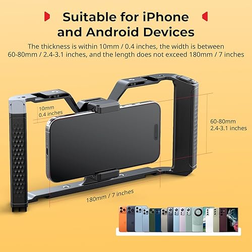 Compatibility: Universal phone cage compatible with most mobile phones such as for iPhone 17 / 16 / 15 / 14 / 13 / 12 Pro / Pro Max, for Samsung Galaxy S24 / S23 / S22 Ultra, for Pixel 8/7/6/5 series, for Huawei Mate 60/50/40/P Series, and so on.