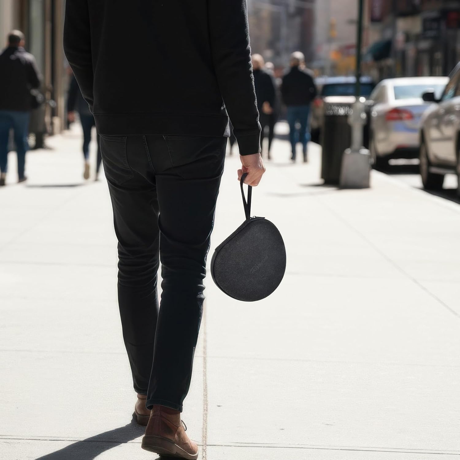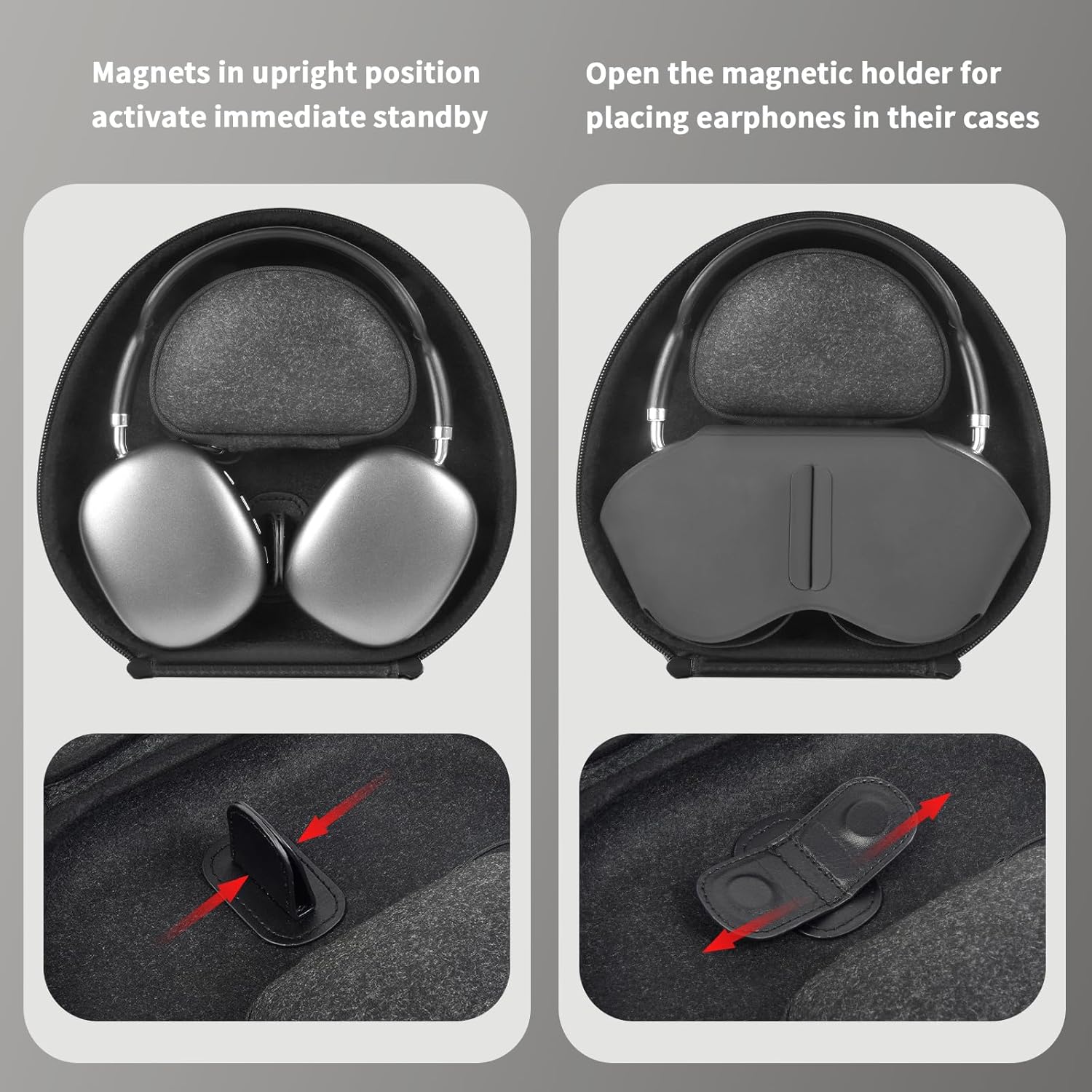 Dual Magnetic Structure & Carry Handle:For airpod max carrying case features a dual magnetic structure that allows two storage methods. Adjusting the magnetic flap can either accommodate headphones with sleeves or activate standby mode when upright, preventing accidental activation. Magnetic parts are firmly aligned and securely fixed without affecting placement or protection. A reinforced handle on top provides a comfortable grip and solid carrying support
