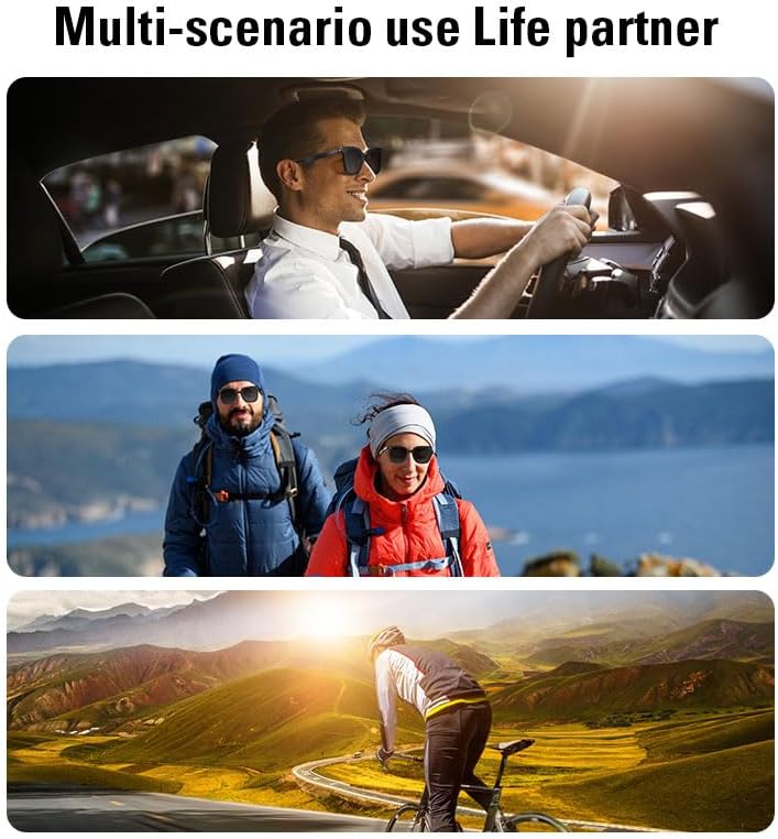 【Open-ear Bluetooth speakers】These Smart glasses feature clever integration of mini dual stereo speakers inside the individual temple arms, allows you to stay aware of your surroundings while enjoying music. Support wake up voice control, help you achieve wireless control of the mobile phone (within 40 ft) blind touch operation, so that you can hands-free navigation, make and receive calls, cut songs.