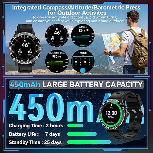 【Health Monitoring】Mens smart watch uses advanced high-performance sensor monitors, offers blood pressure/heart rate/respiratory rate/sleep monitoring. Additionally, it provides sedentary reminders, encouraging you to stay active. As a rugged fitness tracker, this smartwatch helps you maintain a healthy lifestyle amidst your busy schedule, ensuring you keep track of essential health metrics.But the watch is not a substitute for medical devices and cannot be used for medical purposes.