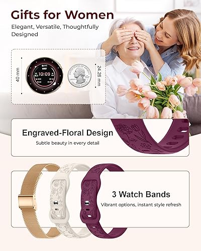Elegant Gift-Ready Design: Includes 3 swappable bands – a chic rose gold stainless steel mesh band plus two engraved floral-patterned silicone straps (burgundy and ivory), so she can effortlessly adapt her style to any moment. A meaningful choice among gifts for women – perfect for birthdays, anniversaries, or simply showing you care. It’s a stylish companion with heartfelt value