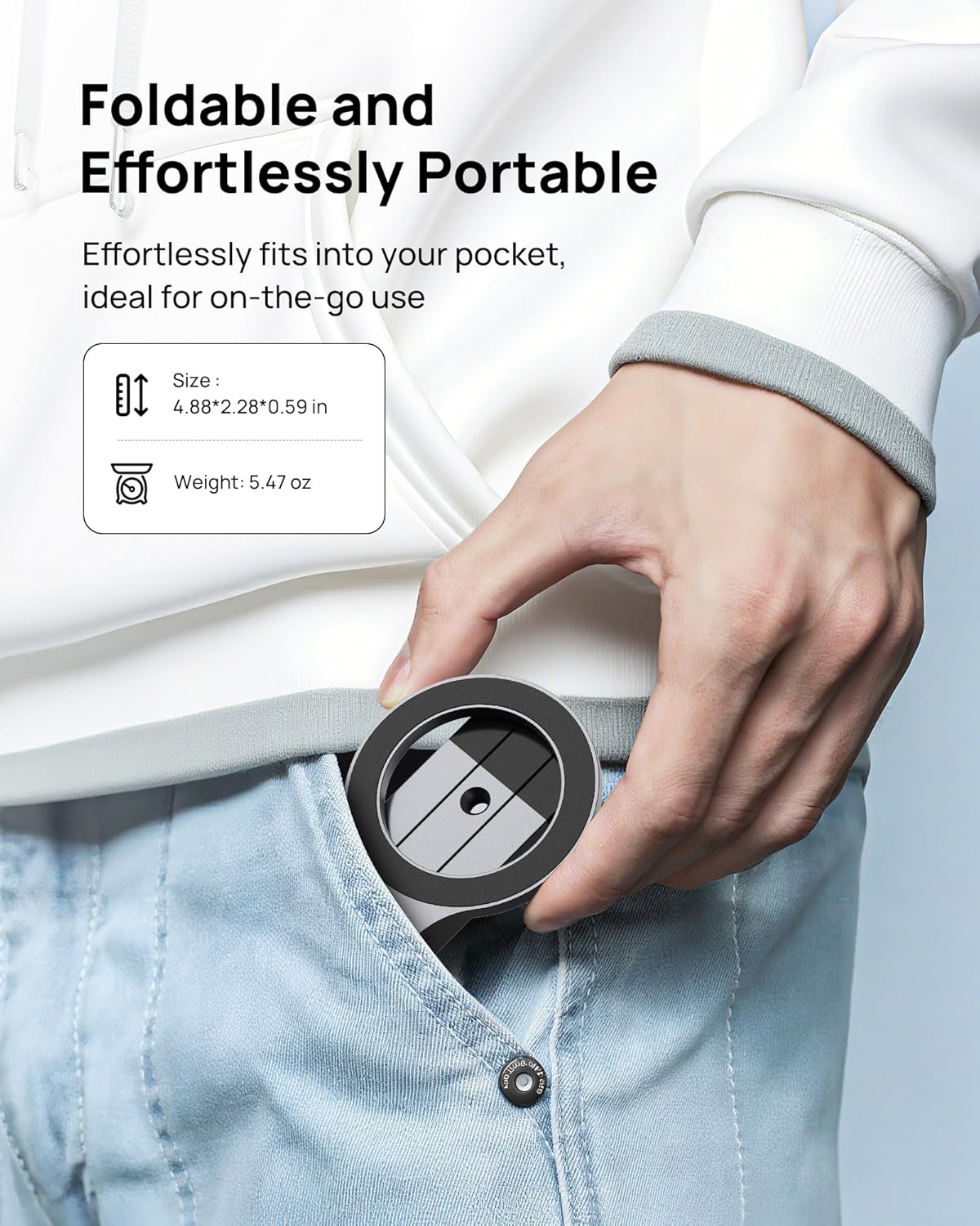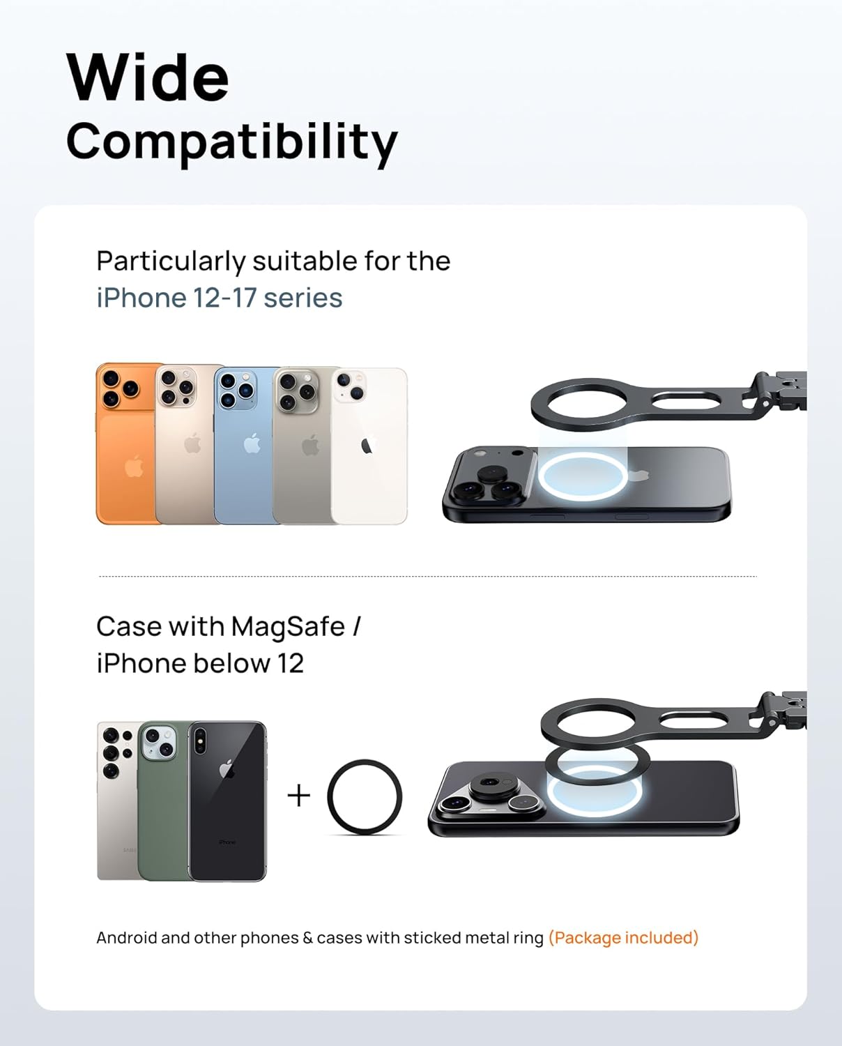 【Universal Compatibility & Everyday Use】Widely compatible with iPhone 12, 13, 14, 15, 16, 17 series and Magnetic cases, this mag-safe stand also includes a magnetic ring for Android smartphones. Its secure connection and stable design make it ideal as a magnetic phone holder for gym or desktops, or compact travel essentials for creators always on the go.