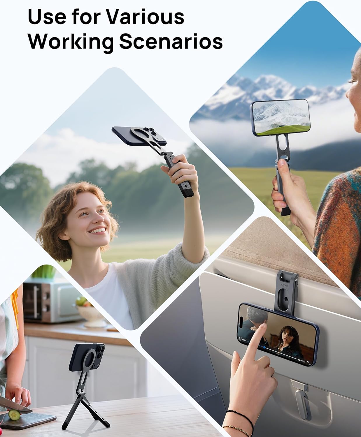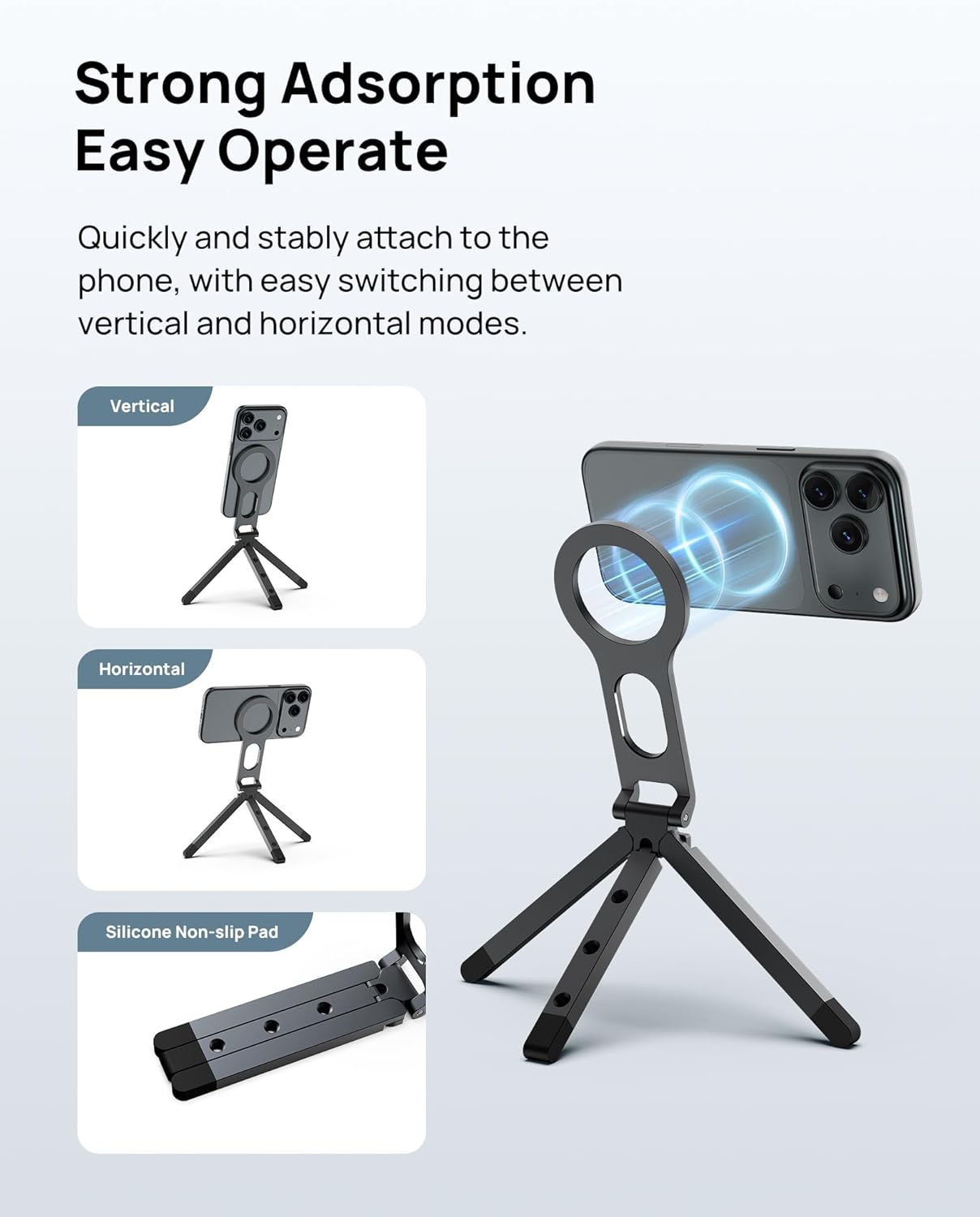 【3-in-1 Versatile Functionality】 Transform this mag safe tripod into a handheld grip, mini iphone tripod stand, or desktop cell phone stand in seconds. Whether you’re streaming, vlogging, or taking selfies, the multi-functional design adapts instantly. The adjustable hinge provides flexible angles, making it an ideal phone stand for recording, video calls, or live streaming anywhere.