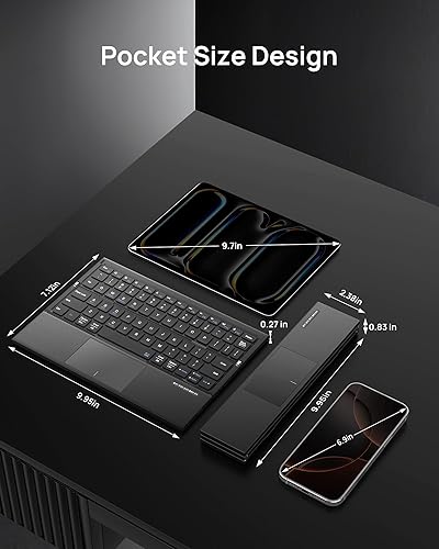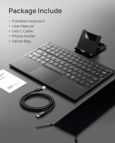 【Tri-Fold Bluetooth Keyboard】The 2025 upgraded folding keyboard features a smooth accordion-like motion for ultimate portability, unfolding and folding away in just one second. Its built-in touchpad has the same layout as a standard laptop, aligning with your muscle memory. Instead of adding bulk, this foldable keyboard with trackpad gives you the power of a full-size keyboard in an exceptionally thin & light design.