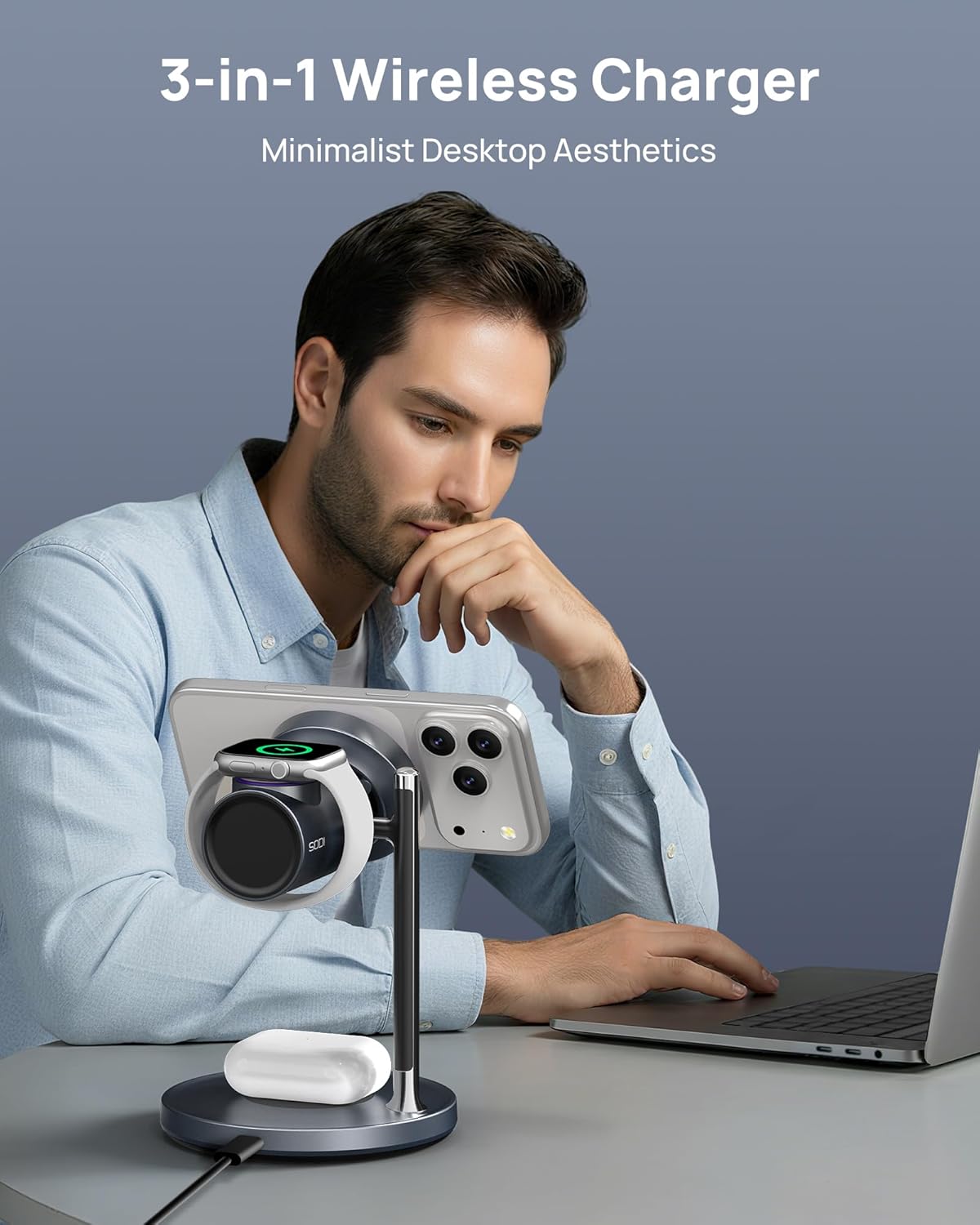 Wide Compatibility: This charging station for multiple devices offers: Qi2.2 25W for iPhone 17/16 Series (iOS 26+ required), 20W for iPhone 17 Air, Qi2 15W for iPhone 15/14/13/12. (Excluding SE, mini, 16e.) 2.5W for all Apple Watch models. 5W for AirPods 4(ANC)/3/2/Pro/Pro 2 and other Qi-enabled earbuds.