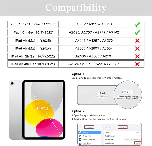 [COMPATIBILITY]: Exclusively designed for Newest iPad (A16) 11th generation 11 inch 2025(Model Number: A3354/A3355/A3356) & iPad 10th generation 10.9 inch 2022(Model Number: A2696/A2757/A2777/A3162).Not fit any other iPad models.Please check back bottom of your iPad to find the model number