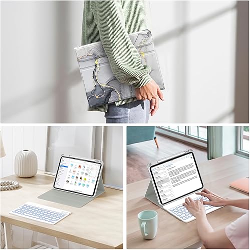 Soke for iPad (A16) 11th/10th Generation Case with Keyboard(2025/2022)-7 Color Backlight Wireless Detachable Folio Keyboard Cover with Built-in Pencil Holder for iPad 11/10.9 inch, Ice Blue Marble(A-Grey Marble)