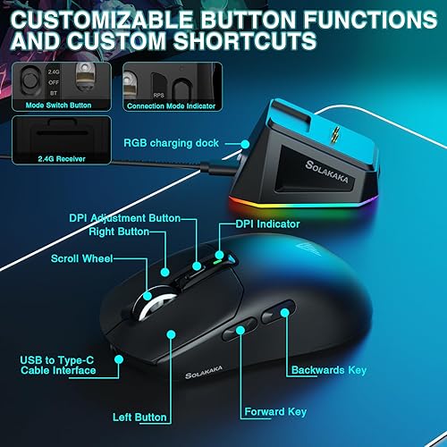 SOLAKAKA SM820 Wireless Gaming Mouse with RGB Charging Dock,24000 DPI Tri-Modes Wireless Mouse with 2 Side Buttons,Programmable Macro Mouse for Gaming(Black)(black,SM820)