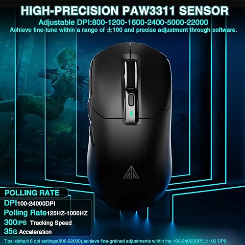 High-Precision Sensor:SM820 wireless mouse with side buttons is equipped with a high performance PAW3311 optical sensor,boasting low latency and exceptional precision.This MMO mouse allows you to fine adjust the DPI from 100 to 24000 (±20%),the polling rate up to 1000Hz,tracking speed 300IPS,acceleration 35G.Whether you're performing precise maneuvers or making rapid movements,this gaming mouse offers unparalleled accuracy,ensuring that every in game command is flawlessly translated onto the screen