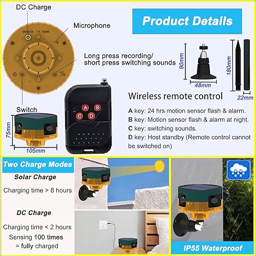 【Widely Used】Our sensor alarm has IP55 waterproof function, can be charged by solar energy, and can be placed in home, orchard, construction site, farm and other places where there is needed, or DC charging as a backup energy source for long-term circulation.