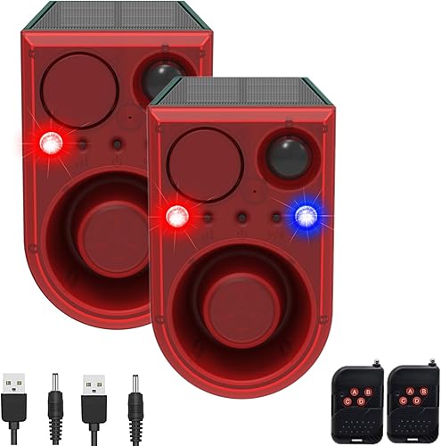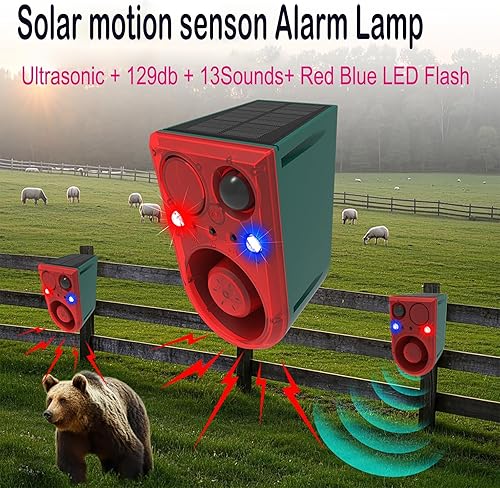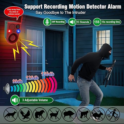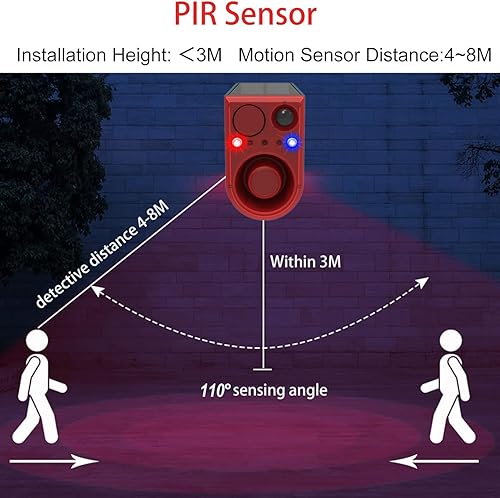 High-Efficiency Siren: Our sirens feature a novel and unique design of red and blue flashing lights, a 129 dB high alarm tone, a built-in PIR motion sensor that detects movement within a 120-degree arc and can detect movement within 26 feet, emitting ultrasonic waves with a frequency of 12-44kHz to scare dogs, cats, wild boars, mice, birds, and other animals away from your area, house, garden, or yard