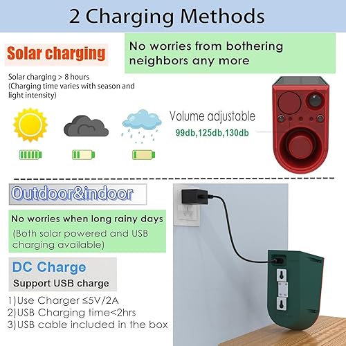 SOLAR AND DC CHARGING: Solar motion detector alarm are solar powered and USB charging, Sufficient for daily work when the sun is sufficient. USB charging as a backup for long rainy days to ensure it works non-stop.which can work for up to 8 hours after fully charged under sunshine; You can also charge it by DC power adapter for about 1 hour in rainy or cloudy days, very convenient to use.