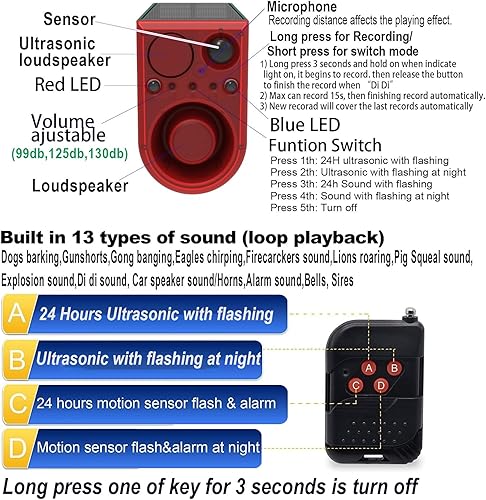 4 Modes: The solar motion detection siren has 4 different modes that you can set according to your needs: Mode 1: 24-hour ultrasonic and red blue flashing light; Mode 2: Ultrasonic red blue flashing light at night; Mode 3: 24-hour roduces sound alarm flashing; Mode 4: roduces sound Alarm flashes at night. You can choose between 24-hour mode or 12-hour night mode, as well as ultrasound mode or alarm mode