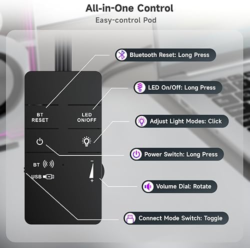 Easy-Control Pod: Enjoy effortless control with the dedicated multi-function pod. Each button is intuitively assigned to a specific function—switch modes, adjust LED lights, control volume, or reset Bluetooth—all with a simple press