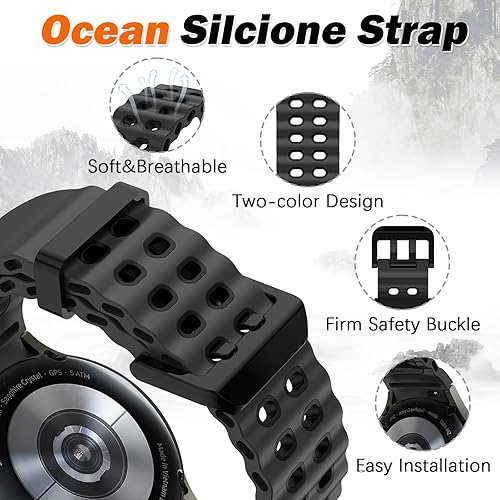 【Ocean Breathable Design】: These silicone straps adopt a brand-new perforated ocean design, allowing air to freely shuttle through your wrist, comfortable and breathable. The unique color matching and classic appearance combine to add charm to your watch, which is very suitable for running, swimming, climbing, cycling and other sports.