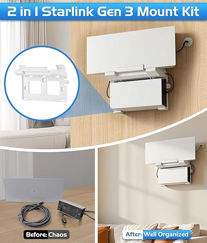 【2-in-1 Router Mount】The included router mount integrates your Starlink Gen 3 router and power cable into a compact form. By keeping cables and devices together, it eliminates clutter, frees up workspace, and creates a clean, organized setup—perfect for RVs, living rooms, offices, and more.