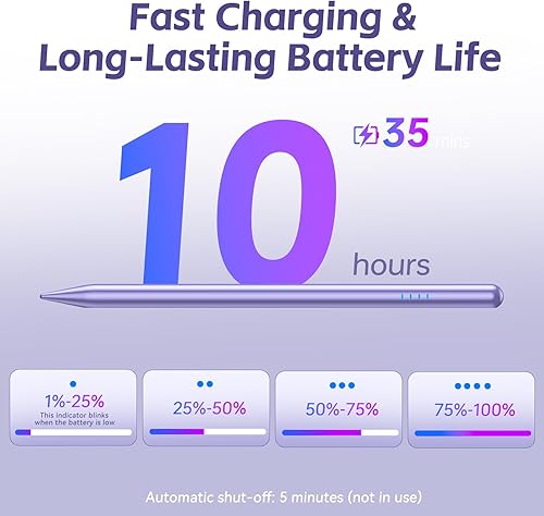 【Battery Level Indicator】 This stylist fine point pen also features LED indicators that show the remaining battery power and charging progress. This allows you to easily and clearly see the remaining power in any situation, so you don't have to worry about battery life. Battery level indicator: four lights on: 75% - 100% power, three lights on: 50% - 75% power, two lights on: 25% - 50% power, one light on: less than 25% power