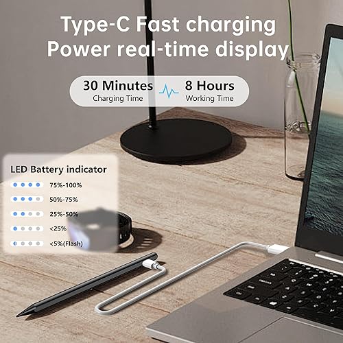Battery Level Display: Easily monitor the remaining battery level of the stylus pen through 4 indicator lights.When four indicator lights are on, it indicates that the battery level is between 75% and 100%. When one indicator light is on, it indicates that the battery level is below 25%. Please act quickly when the indicator lights are flashing. This for apple ipad pencil adopts the Type-C charging design.It takes 30 minutes to fully charge and has a usage time of up to 8 hours.