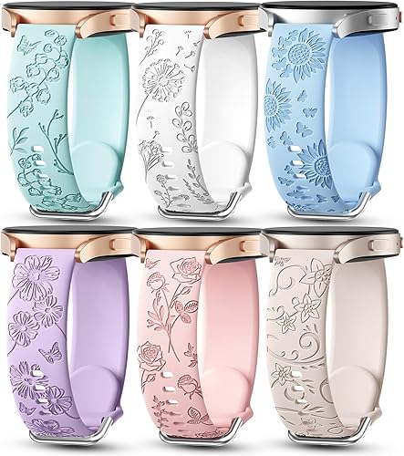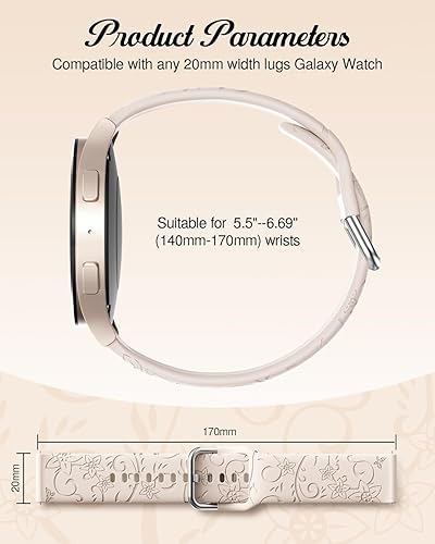 [Compatible Models]: Sunnywoo 6 Pack silicone floral engraved bands for women are designed for samsung smartwatches with 20mm lug width, compatible with galaxy watch 7/6/5/4 (40mm/44mm), galaxy watch active 2, galaxy watch 6 classic (43mm/47mm), galaxy watch 5 Pro (45mm), galaxy watch 3 (41mm), galaxy watch 4 classic (42mm/46mm), galaxy watch FE, and Gear S2/Gear sport models. Universally adaptable to any 20mm lug smartwatch regardless.