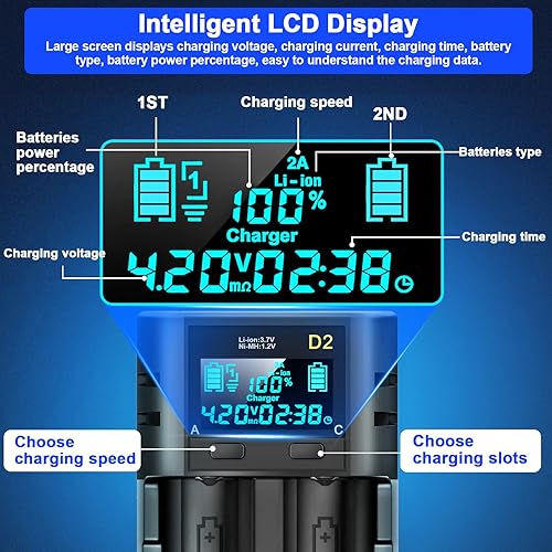 Swanlake 18650 Battery Charger,2 Bay Intellicharge LCD Display Charger for Rechargeable Batteries Li-ion NI-MH NI-Cd AA AAA C 21700 26650 18650 18350 18700 13650 16340 RCR123