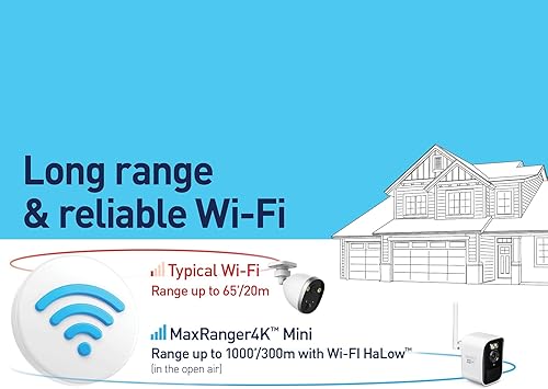 From Gates to Garages, Monitor Everything Within 1000ft/300m:Powered by Wi-Fi HaLow, the MaxRanger4K Mini redefines wireless surveillance, eliminating traditional Wi-Fi range limitations. Cover large properties with a perimeter distance of up to 1000ft/300m in line of sight & 330ft/100m through obstacles. Stronger & more reliable Wi-Fi HaLow technology is designed for today’s homes, able to penetrate walls, ceilings, cement, trees & more -it is free from the clutter & signal interruptions of traditional 2.4GHz Wi-Fi.