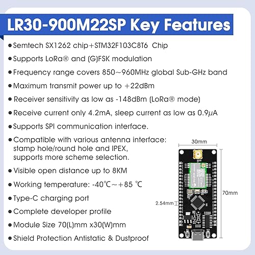 【8KM transmission distance】DX-LR30 transmission distance is up to 8KM. Support 850~930Mhz frequency band communication, 22dBm power, support programming, SPI interface, firmware development needs to be done by yourself. 32Mhz crystal frequency, TTL level output, compatible with 3.3~5V IO port voltage.
