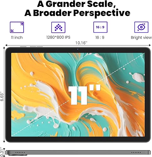 Vibrant 11-Inch HD Display : Immerse yourself in crystal-clear visuals on the 11 inch android tablet's vibrant 1280*800 IPS screen. Featuring a resolution that brings movies,and books to life, this display offers wide viewing angles and rich colors. Designed with screen brightness adjustment,it reduces blue light emissions and flicker, making it safer for adults during late-night reading. Whether you're using it as a reading tablet or for streaming, the clarity and comfort are unmatched.