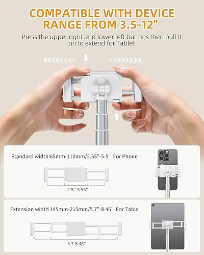 【Stable and Durable】The base is strong and stable and will not tip over. The stand is made of high quality aluminum and magnesium alloy, making the arm sturdy enough to hold the phone and tablet firmly. (Note that when retracting the main pole into the telescopic pole, you will need to align the grooves on the main pole to retract it.)