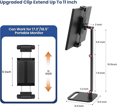 Upgraded Clip---Our portable monitor mount with a built-in metal rod,sturdy and durable.It can extend from 5.4 inches to 11 inches,supporting 15.6'',17.3'',18.5'' max portable monitor;The clip equipped with silicone pad,protecting your monitor from scratches.