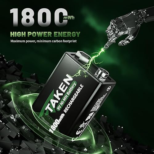 SAFE, LEAK-PROOF & ECO-FRIENDLY: TAKEN NiMH Rechargeable 9V Batteries are designed to be absolutely safe and are the world's first 9Vlot batteries to use 24% recycled materials. With ultra-leak-proof technology, they deliver reliable performance while minimizing impact on the environment. Choose our sustainable option and enjoy worry-free, eco-friendly energy