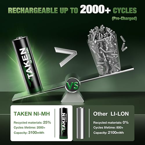 SAFE, LEAK-PROOF & ECO-FRIENDLY: Designed to be absolutely safe, TAKEN NiMH Double A batteries are the world's first AA batteries to use 25% recycled materials. With ultra-leak-proof technology, they deliver reliable performance while minimizing environmental impact. Choose our sustainable option and enjoy worry-free, eco-friendly energy.
