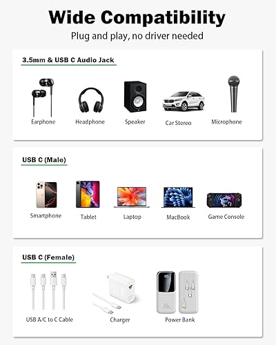 Compatible Devices: (function(f) {var _np=(window.P._namespace("DetailPageProductOverviewTemplatesJava"));if(_np.guardFatal){_np.guardFatal(f)(_np);}else{f(_np);}}(function(P) { P.when('A').execute(function(A){ A.on('a:truncate:po-attribute-truncate-0:updated', function(data) { var isTruncated = !data.truncateInstance.getIfTextFits(); var seeMoreElement = document.getElementById('po-attribute-see-more-id-0'); if(seeMoreElement) { seeMoreElement.style.display = isTruncated ? '' : 'none'; } }) }); })); USB C Charging Splitter Dongle Cable for USB to USB C Cable or USB C to USB C Cable., USB C to 3.5mm Audio Adapter for Wired Earbuds with 3.5mm Plug, USB C to USB C Headphone AUX Audio Jack for Wired Earbuds in-Ear USB Type C Earphones,., USB C to 3.5mm Headphone and Charger Multiport Adapter is compatible with most USB-C or Thunderbolt devices such as MacBook Pro/MacBook Air, iPhone 17, iPhone 17 Air, iPhone 17 Pro, iPhone 17 Pro Max, iPhone 16, iPhone 16 Pro, iPhone 16 Pro Max, iPhone 16 Plus, iPhone 15, iPhone 15 Pro, iPhone 15 Pro Max, iPhone 15 Plus, iPad Pro 13-inch (M4), iPad Pro 12.9-inch (1st, 2nd, 3rd, 4th, 5th, and 6th generation), iPad Pro 11-Inch (M4), iPad Pro 11-inch (1st, 2nd, 3rd, and 4th generation), iPad Air 13-Inch (M2), iPad Air 11-Inch (M2), iPad Air (4th, and 5th generation), iPad mini (6th generation),iMac, Samsung Galaxy / Note / Tab / Z Flip / Z Flod, Google Pixel, Huawei, Xiaomi, Switch, HTC, LG, Nokia, Motorola, Sony, Kindle Fire HD 10, Steam Deck, Blackberry Nexus, Tablets, Oneplus, Kindle fire, XPS 13/15/17; Surface Book/ Pro; Google Pixelbook, Asus ZenBook, Chromebookand many other USB-C laptops, tablets, and smartphones, PCs., USB C to USB C Headphone Auido Adapter for USB C headphone, flash drive, card reader, camera, hub, Oculus VR, Playstation, Xbox,, Mouse, Keyboard, Printer, Scanner and other USBC computer peripherals. See more