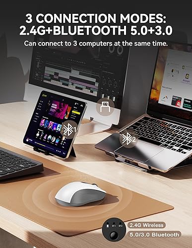 Dual Mode for 3 Devices - This computer mouse offers Bluetooth 5.0/3.0 and USB-A connection, can connect up to 3 devices. Seamlessly switch between your laptop, PC, tablet, and MacBook with a single click. Elevate your workflow and conquer multitasking.