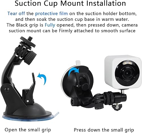 No Drilling Installation: The black grip can eliminate the air inside of suction cup mount, no tool needed, no residual and scratch left. Firstly, The small black grip is Fully Opened, then mount can be firmly attached to the surface. Finally, Please make sure camera suction mount firmly attached to the Smooth Surfaces and then press the grip down