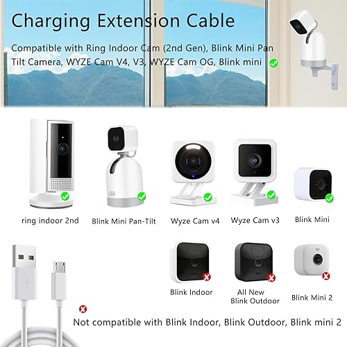 Widely Compatible:The charging extension cable is compatible with Blink mini, Blink mini pan tilt camera, WYZE Cam V4, V3, WYZE Cam OG, Ring Indoor Cam (2nd Gen)