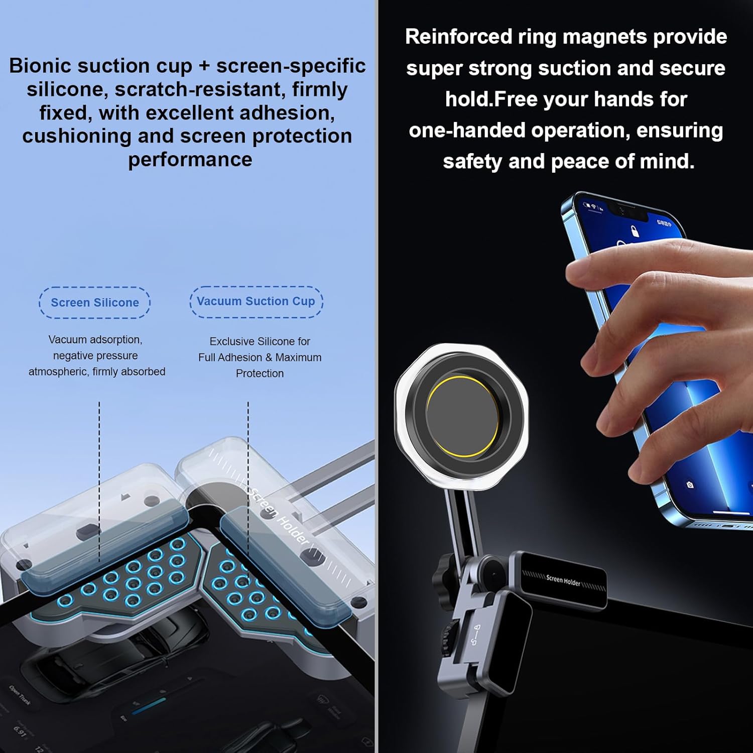 [360° Adjustable, Full Screen Protection] The thickened alloy center bracket is durable and strong enough to withstand heavy loads without bending or cracking. The 360° multi-directional ball joint supports any viewing angle, whether in landscape or portrait orientation. No glue is required for installation, leaving no residue. The fully enclosed silicone pad firmly grips the screen, preventing slippage or scratching. The vacuum suction cup ensures stability and prevents wobble.