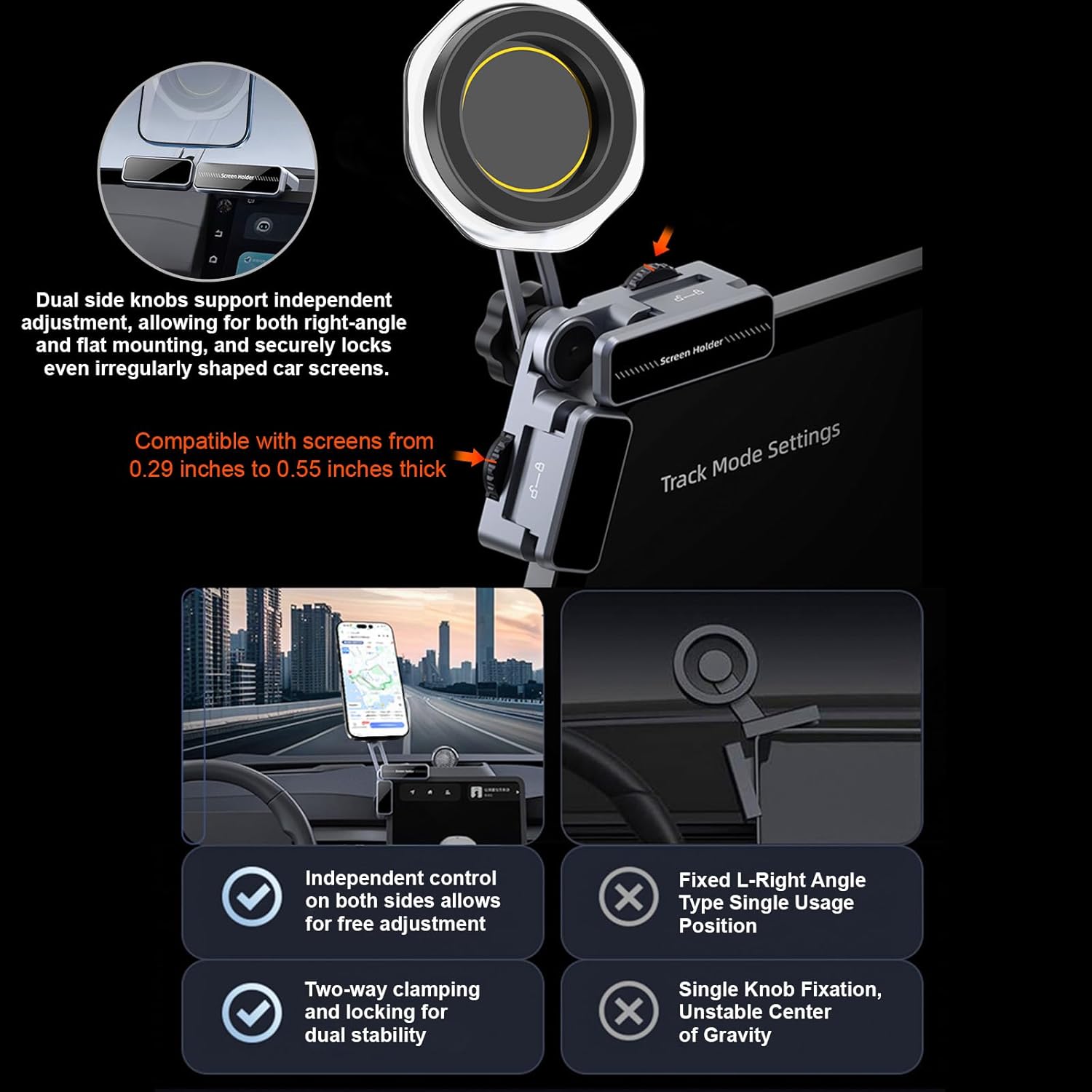 [Dual Independent Knob Adjustment] Two independent knobs adjust the angle and thickness for seamless, flexible installation. This provides a variety of mounting options, supporting not only right-angle and flat mounting, but also mounting monitors at unusual angles. Whether you need a horizontal or vertical mounting, this bracket stays securely in place, even on bumpy roads or during emergency braking.