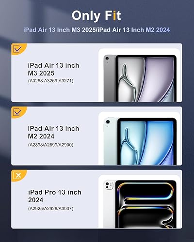 Compatibility: Preciously designed for iPad Air 13 inch M3 2025(Model number: A3269/A3271), iPad Air 13 inch M2 2024(Model number: A2898/A2899/A2900). Please check the back bottom of your ipad to find the model number