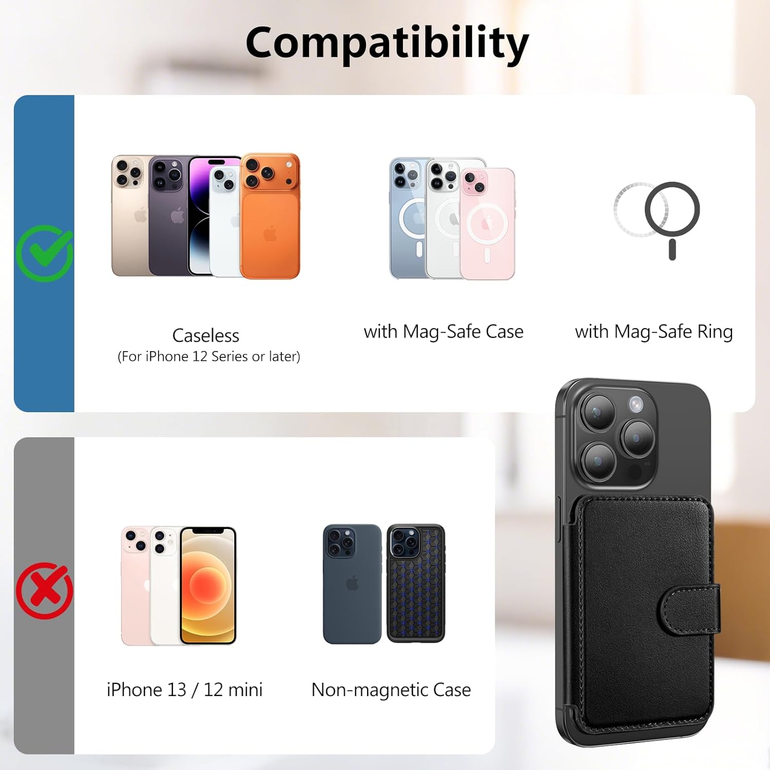 【Compatibility】: Magnetic card wallet is compatible with iPhone 17 Pro Max/17 Pro/17 Air/17, 16 Pro Max/16 Pro/16 Plus/16, 15 Pro Max/15 Pro/15 Plus/15, 14 Pro Max/14 Pro/14 Plus/14, 13 Pro Max/13 Pro/13, 12 Pro Max/12 Pro/12, Also for the official magnetic cases and other magnetic cases. (Not for iPhone 13/12 Mini)