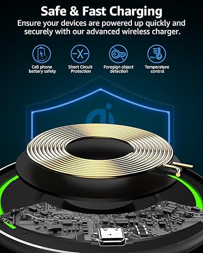 [Sleep-Friendly LED Indicator and Safe to Use] The wireless charger will light up blue for 10 seconds and then turn off during charging, quietly uses LED lights to display charge status, allowing undisturbed sleep with no notification sounds.With built-in protections against over-voltage, over-temperature, over-current, short-circuit, and other potential hazards, it keeps your device's battery safe from overcharge damage.