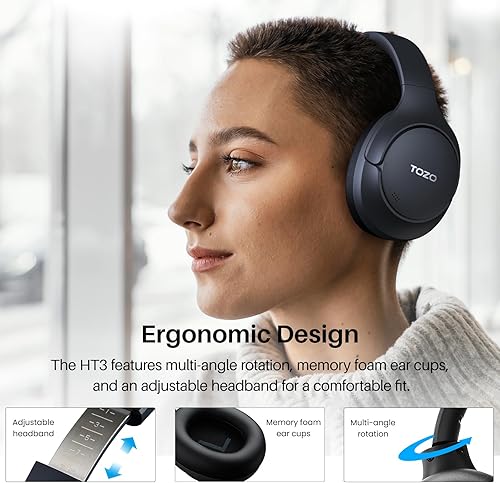 • [All-day Comfort & Adjustable Design] TOZO HT2 uses ultra-soft protein leather earcups, which allows you to wear it for a long time without feeling uncomfortable. The earmuffs can also automatically adjust the angle to suit users with different head shapes. Making them the ideal headphones to work from home or watch your favorite movie.