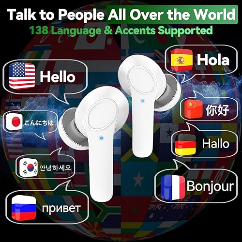 TRANSLATING EARBUDS REAL TIME SUPPORTING 138 LANGUAGES – These translation earbuds function as a language translator device with real-time translation in 138 languages and accents, perfect for travel, study, and global communication.
