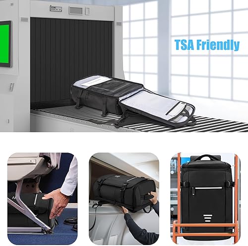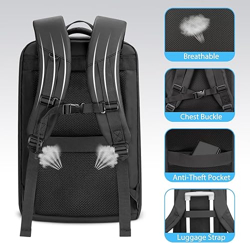 【Safety & Waterproof】: A sleek and stylish the travel backpack carry on flight approved. Features full-coverage waterproof coating with sealed seams, causing water to bead up and roll right off. Even in extreme weather, it reliably protects your laptop and clothing. The dedicated laptop compartment includes elastic retention straps to secure your device safely - no worries about impacts during transit.