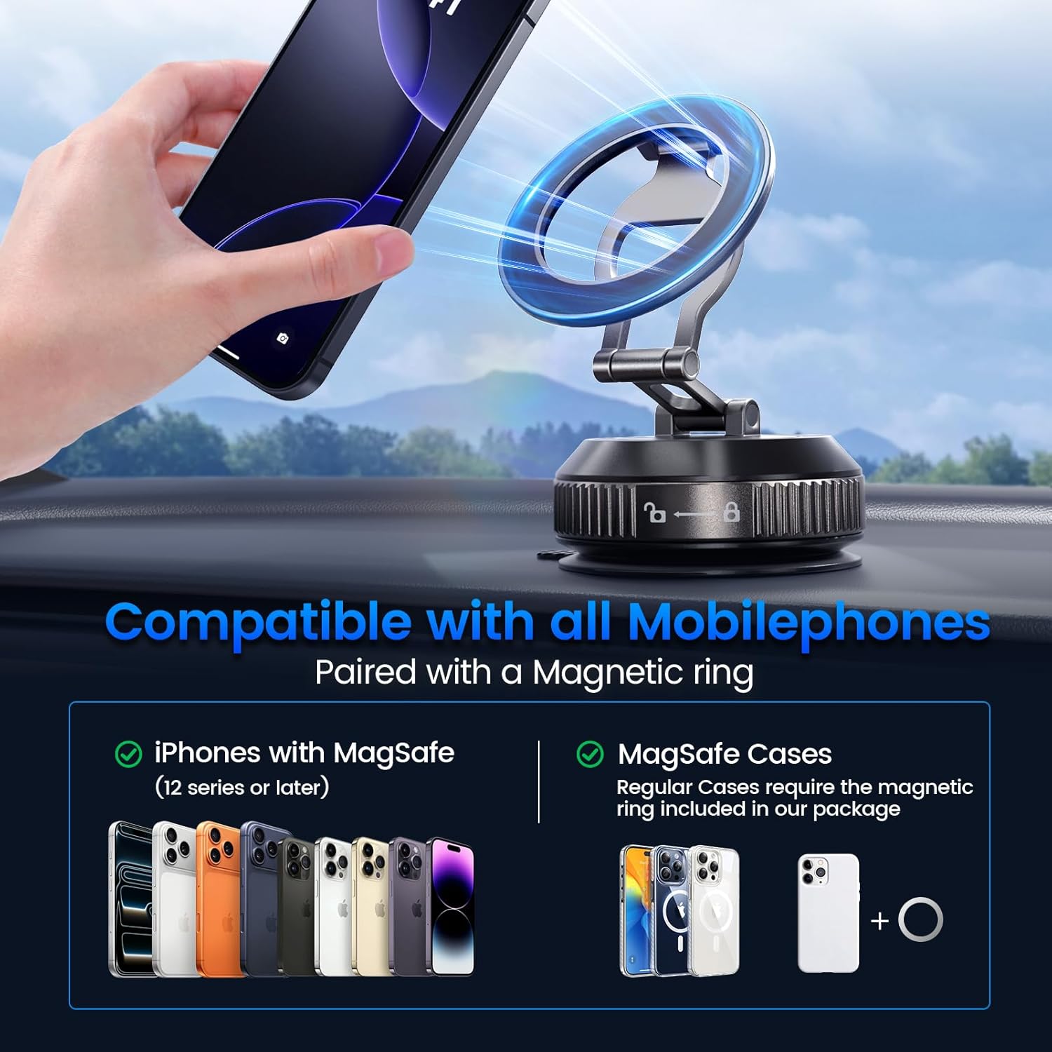 【Wide Compatibility & Easy Installation】This product is not only compatible with iPhone 17/16/15/14/13 series, but also adapts to all mobile phones with magsafe, and also comes with a magnetic ring to provide users of non-magsafe mobile phones with the same strong magnetic capability, its wide compatibility is suitable for various vehicle interiors, safe and easy to install in various models, fast and easy. What are you waiting for, hurry up and take it home!