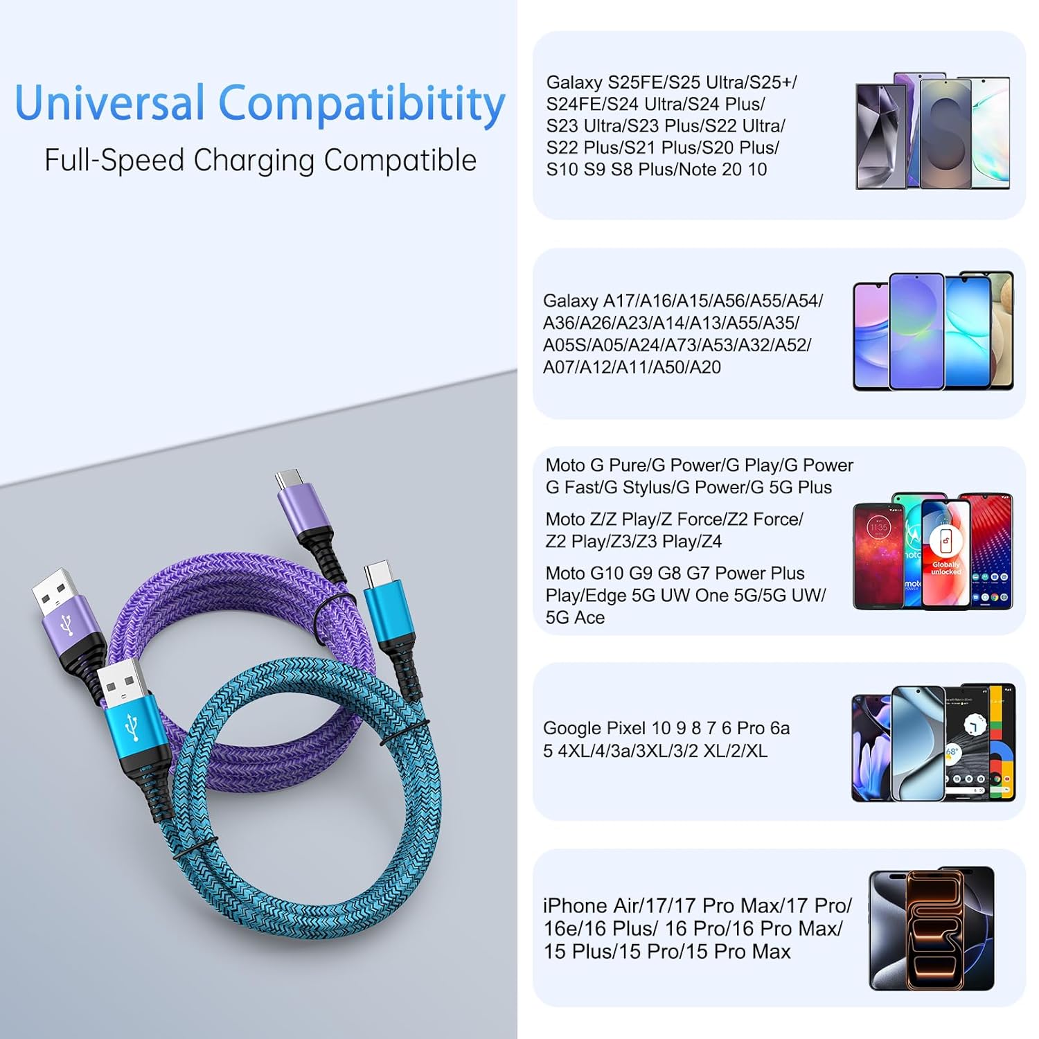 Universal Compatibility: Samsung Galaxy cord is fast charging for Samsung Galaxy A17/A16 5G/S25FE/S25 Plus/SS25 Ultra/S24FE/A25/A23/A56/A36/A26/A07/A06/A05S/A15 5G/A35 5G/A55 5G/A73/A53/A13/S24 Ultra/S24 Plus/S23 Ultra/S23 Plus/S22 Ultra/S22 Plus/S21 Ultra/S21 Plus/S21FE/S20fe/S20 Plus/Note 20 Ultra/10/9 A12 A11 A32 A42 A52 A51 A71 S10 S9 S8 Plus A10E A20 A50; Motorola G9 G8 G7 Power/Edge 5G UW/Edge/G Play/G Power/G Stylus/One 5G UW ace/X4 Z Z2 Z3 Z4; Google Pixel 9 Pro 8 7 6 Pro 5 4XL/4/3a/3XL; LG; OnePlus and more USB C cellphones.
