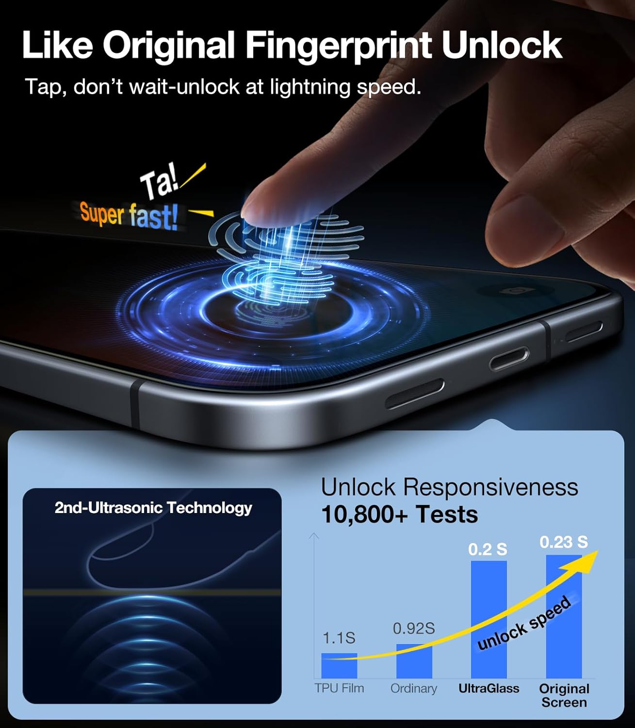 【Unbreakable TOP 9H+ Glass, the Excellent 2nd Screen for Your iPhone】Boasting unparalleled shatter resistance and durability. The core excellence is the top 9H+ tempered glass material, which is widely applied in aerospace and military fields for its ① Shatter-proof ② Scratch & Wear Resistance ③ Durability that is 7-8 times higher than other materials. Thus, UltraGlass builds a second tough screen for your iPhone 16 Pro.