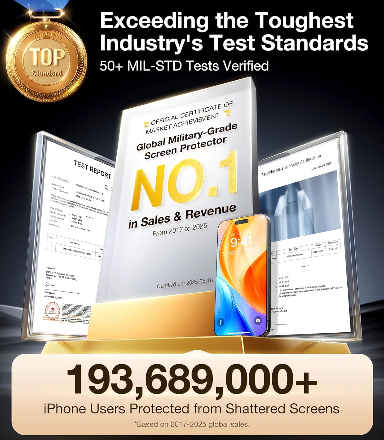 【Industry NO.1 Military-Grade Shatterproof】Authorized by the International Military Standard with 50+ rigorous engineering tests of 220 lbs impact, 8,000+ drop tests, 20,000+ scratch tests, etc., its strength, toughness and durability perform NO.1 among all glass. By especially breaking the industry's record with a 12ft drop, the iPhone 17 screen protector is ensured to be unbreakable from its surface to every edge and corner.