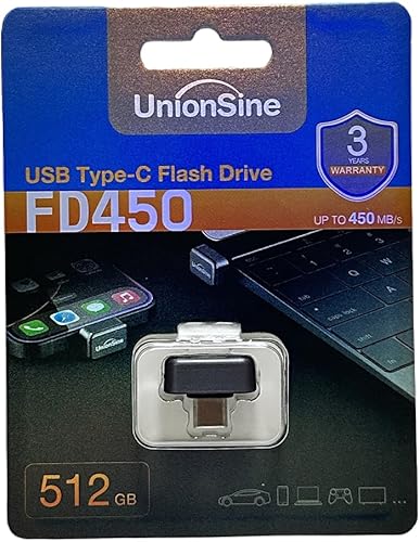 UnionSine USB C External SSD 512GB, USB3.2 Solid State Flash Drive Up to 450MB/s, Mini Type-C USB Drive SSD-Stick for iPhone 15/16/17 Series, Android Phone, Laptop, Tablet, TV, Car Audio(512GB)
